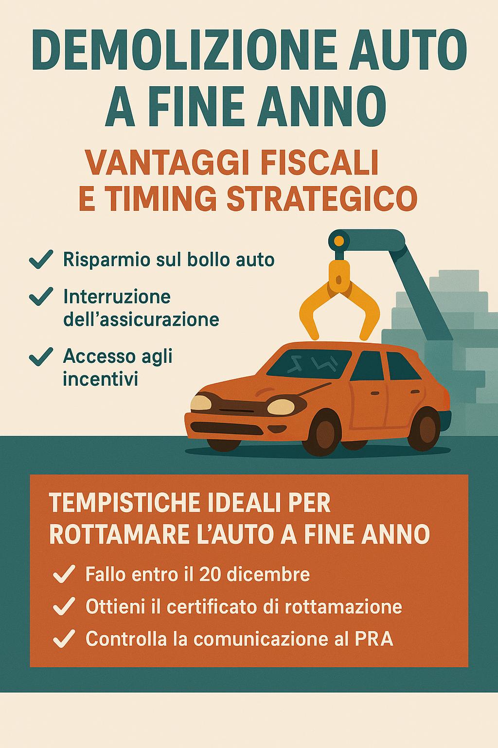 la radiazione al PRA (Pubblico Registro Automobilistico) richiede fino a 30 giorni. Quindi, se consegni l’auto alla demolizione il 31 dicembre, ma la pratica viene registrata a gennaio… hai perso il beneficio.